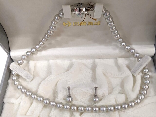 田崎のパールネックレスとイヤリングのセットです。丸亀市にお住まいの50代女性の常連のお客さまにお売りいただきました。いつもご利用誠にありがとうございます。パールのネックレスは、品質によって査定額が上下しますが、こちらのようなブランドものは高額査定になりやすいです。ノーブランドのものも、かなり高額になる場合があります。当店の無料査定をお気軽にご利用ください。
