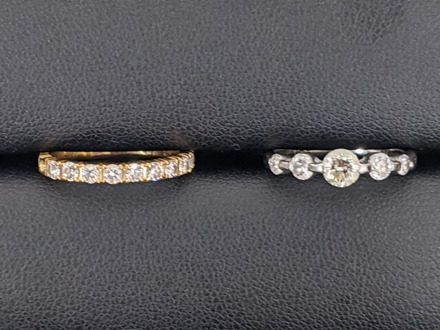 リング2点です。善通寺市在住の40代女性のお客さまにお売りいただきました。ジュエリーは、デザインがあまり好きではなくなった、サイズが合わなくなった、など様々な理由で、使わなくなってしまう場合もあると思います。長期間使っていないものは当店で現金化していただけば、新たなお買物の原資に当てたり、別の用途にご利用いただいたり、お部屋を整理しながら楽しみも生まれることと思います。