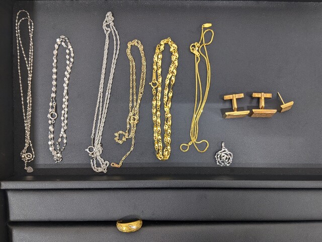 ジュエリーのおまとめです。丸亀市在住の80代男性のお客さまにお売りいただきました。当店ではジュエリーは、できるだけ高額査定になるようにひとつひとつ丁寧に査定します。大量の場合は少しお時間をいただく場合もありますので、フジグランでお買物やお食事がある場合は、先に当店にジュエリーをお預けいただければと思います。